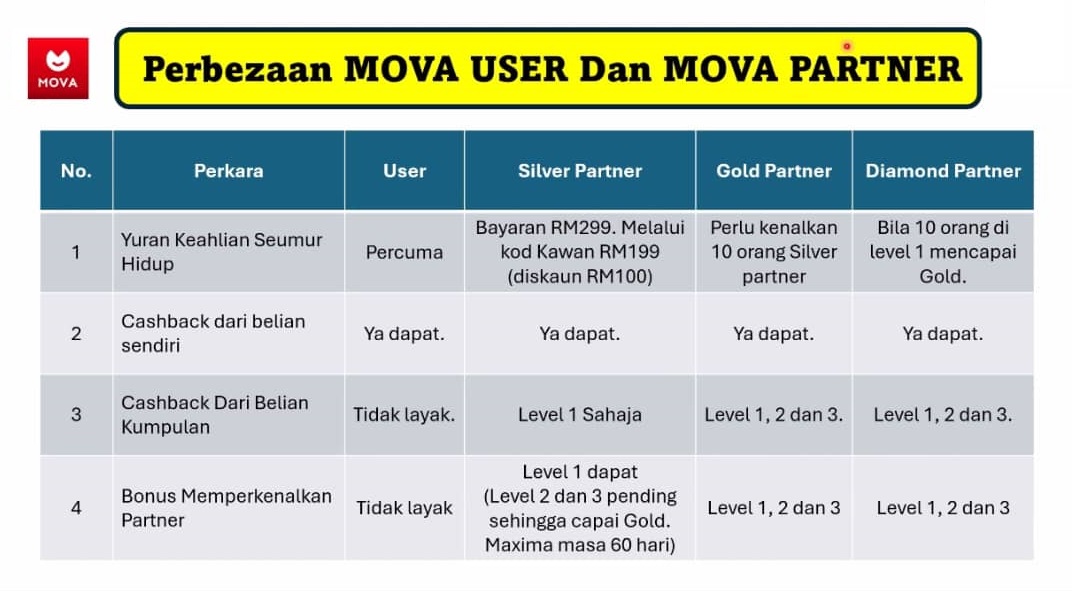 MOVA adalah aplikasi Affiliate untuk Shopee & TikTok. Cashback dari MOVA dikongsi dengan pembeli & Team Affiliate. MOVA telah dilancarkan di Malaysia pada bulan Jun 2025.